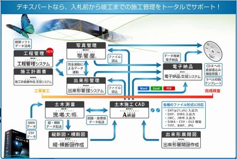 「デキスパート」シリーズは全国導入実績27,000社を誇る土木工事の施工管理トータルソリューションシステム。約30種類のソフトから構成され、それぞれのソフトが「デキスパート基本部」上で起動し、工事名などの基礎情報を共有できる。また、各ソフトのデータ連動にも優れている。技術提案から電子納品までの業務をトータルで管理でき、現場の施工管理を劇的に変化させることが可能。